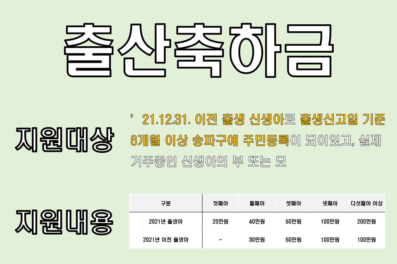 즉, 서울시 송파구에서 '출산'에 대한 지원금은 없는걸로 이해하면 되겠습니다.