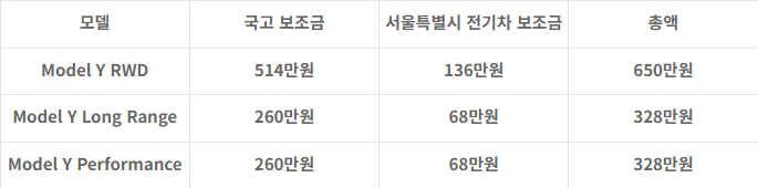 | 인센티브 | 1) 목요이행 보조금 : 140만원 2) 충전인프라 보조금 : 20만원 ← 모델 Y 대상 ※ 테슬라 모델 Y RWD 모델은 14만원 3) 혁신기술보조금 : 20만원 |