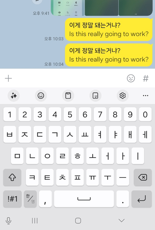 대화 번역 기능은 아시다시피 입력한 문장을 원하는 언어로 번역해주는 기능입니다. 제가 한번 테스트를 해봤는데요 키보드에 '이게 정말 돼는거냐?' 라고 문장을 입력했습니다. (물론 돼는거냐는 잘못된 문법이고 되는거냐? 가 맞는 표현인건 알지만 이후 설명드릴 철자 및 문법 기능 확인을 위해 일부러 틀리게 적었답니다 ^^) 이후 '대화 번역' 버튼을 누르면 아래와 같이 원래 문장 아래 해당 문장이 번역된 문장이 같이 표시되어 입력됩니다.