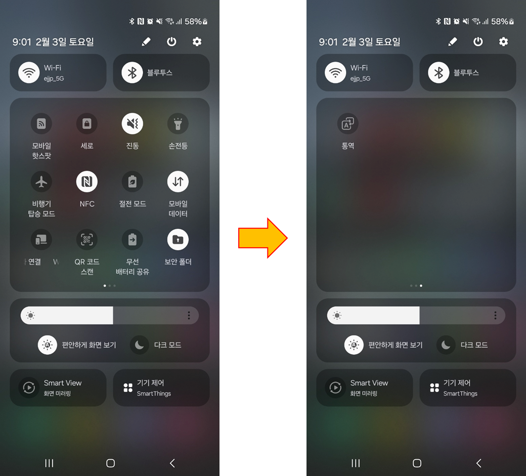 세번째로 갤럭시s24 AI 의 대표기능 3번째 중 마지막인 실시간 통역 기능에 대해 설명드리겠습니다. 첫번째 기능인 전화 중에 실시간 번역하는 기능과 유사합니다만 전화하지 않고 다른 언어를 사용중인 상대방이 바로 앞에 있어 전화가 아닌 실시간 앞에서 대화할 때 사용하는 기능이라고 생각하시면 편할겁니다. 사용방법은 아래와 같습니다. 먼저 핸드폰을 아래로 스와이프 하면 해당 화면이 나올텐데요. 여기서 왼쪽으로 두번 스와이프를 누르면 '통역' 이라는 버튼이 있고, 이를 터치하여 실행시키면 됩니다.