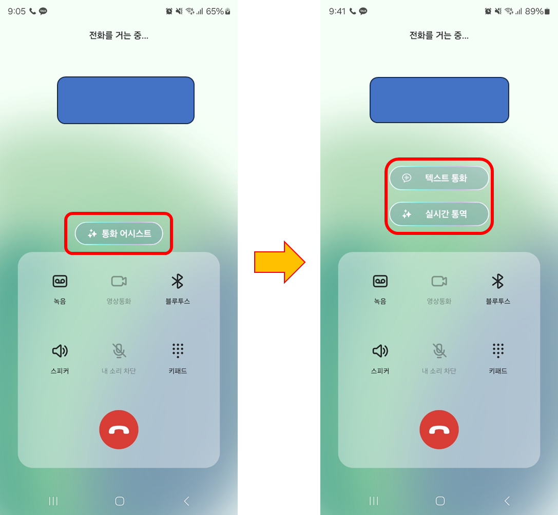 첫번째로 전화중 실시간 통역기능을 사용하는 방법을 설명하겠습니다. 먼저 원하는 상대방 (한국어가 아닌 다른 언어를 사용중인) 과 통화를 진행하시고, 아래 캡쳐된 이미지에서와 같이 '통화 어시스트' 를 누릅니다. 그럼 '텍스트 통화' 와 '실시간 통역' 이 나오는데 말 그대로 텍스트 통화는 상대방과 나의 대화가 자동으로 번역되어 텍스트로 표시되는 기능이고, 실시간 통역은 상대방과 나의 대화를 자동으로 번역하여 ai 음성으로 들려주는 기능입니다. 요약하자면 아래와 같습니다.