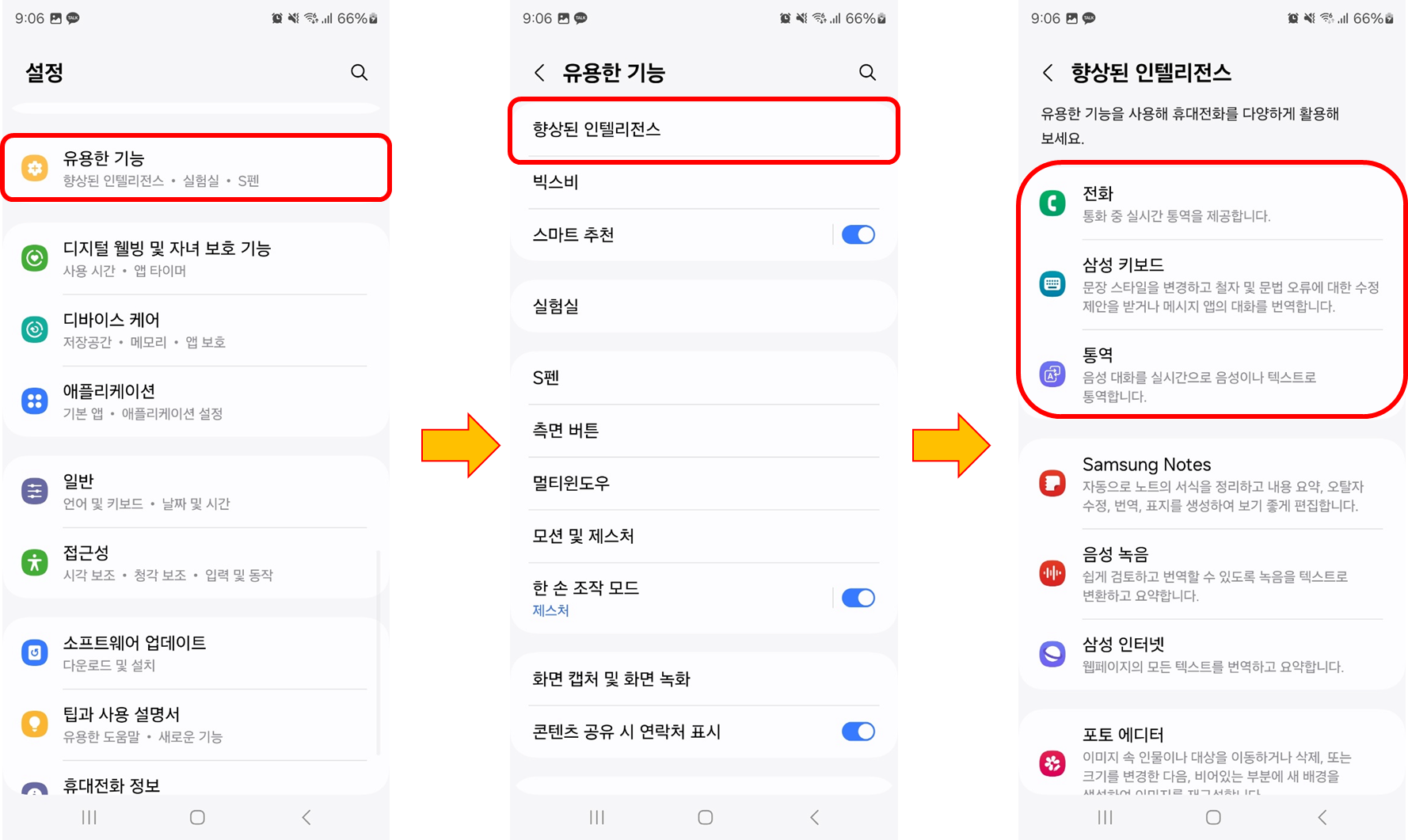 자 그럼 AI 의 대표 기능 세가지에 대해 세부적으로 설정하는 방법에 대해 말씀드리겠습니다. 아래 캡쳐된 이미지를 보시면 설정을 들어가셔서 유용한 기능을 누르시고, 유용한 기능 내에 향상된 인텔리전스를 누릅니다. 자 그럼 위에 말씀드린 대표적인 AI 기능 3가지 항목이 나오고 각 항목을 들어가서 원하시는 언어, 방법, 셋팅 방법을 설정하시면 됩니다.