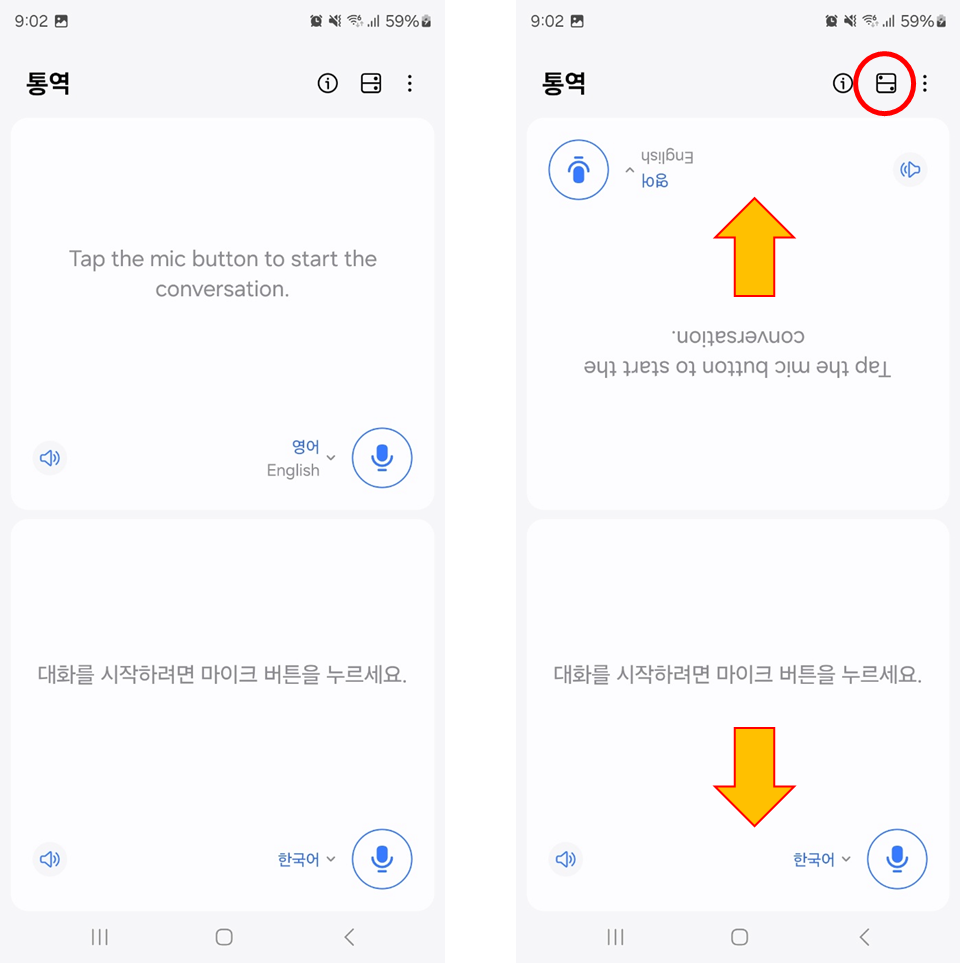 통역 아이콘을 터치하시면 아래와 같이 통역 어플이 실행되는데 여기서 원하시는 언어를 선택하시고 마이크 버튼을 눌러 말을 하면 실시간으로 상대 언어로 번역되어 표시되는 기능입니다. 물론 여기서도 텍스트로 표현될수도 있고, Ai 음성을 통한 말로도 표현해주기도 하니 원하시는걸 선택하시면 됩니다. 추가로 아래 빨간색으로 표시된 아이콘을 클릭하시면 상대방이 내 앞에 있을 때 보기 편하도록 각자의 번역창을 반대로 돌려주는 기능입니다. 이렇게 180도 돌아가 있으면 상대방이 훨씬 보기 편하겠죠?