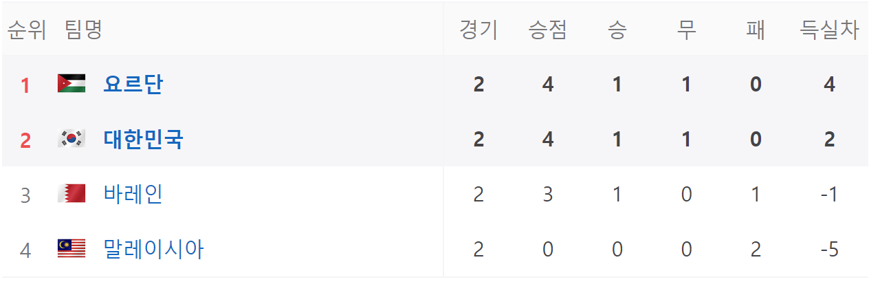 한국과 요르단은 똑같이 1승 1무로 승점은 4점으로 동일하지만 요르단이 득실차가 한국이 비해 높기 때문에