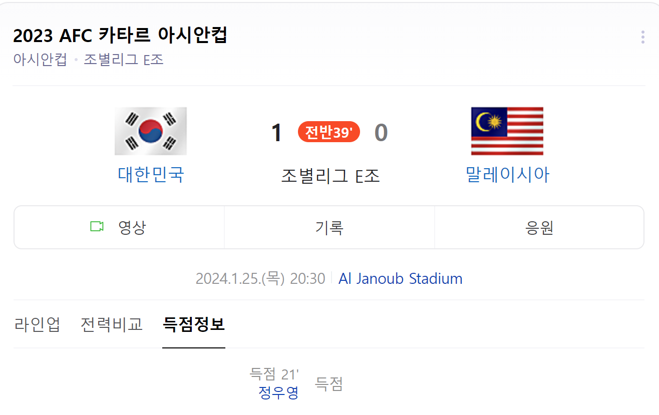 글을 쓰는 와중에 좋은 소식이 있습니다! E조 조별리그에서 대한민국과 말레이시아경기에서 전반 21분 정우영이 선취골을 넣으면서 1:0 으로 앞서가고 있다는 소식입니다.!!! 이대로 승리를 거둬 조 2위로 올라가서 16강에는 사우디아라비아와 경기를 치뤄 일본과의 한일전 나중에... 붙었으면 합니다. ㅎㅎ 일본과 한국이 각자 토너먼트를 올라와서 결승전에 한일전을 하면 정말 꿀잼일 것 같다는 개인적인 의견입니다.!