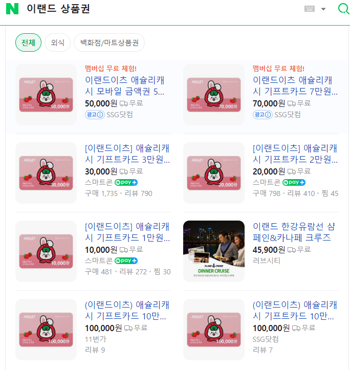 애슐리는 아시는분들은 아시겠지만 이랜드 산하의 외식 브랜드입니다. 가장 유명한 애슐리부터 한식뷔페인 자연별곡 이탈리안 레스토랑인 리미니까지 다양한 프랜차이즈 브랜드를 가지고 있는 회사입니다. 따라서 이랜드 역시 아래와 같이 이랜드 산하의 식당(레스토랑)에서 사용가능한 별도의 상품권을 판매하고 있으며, 미리 상품권을 구매 후 애슐리에서도 사용 가능하답니다.