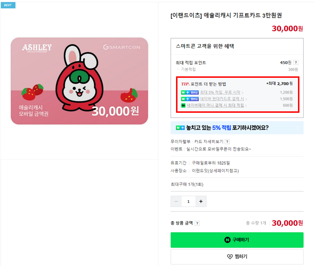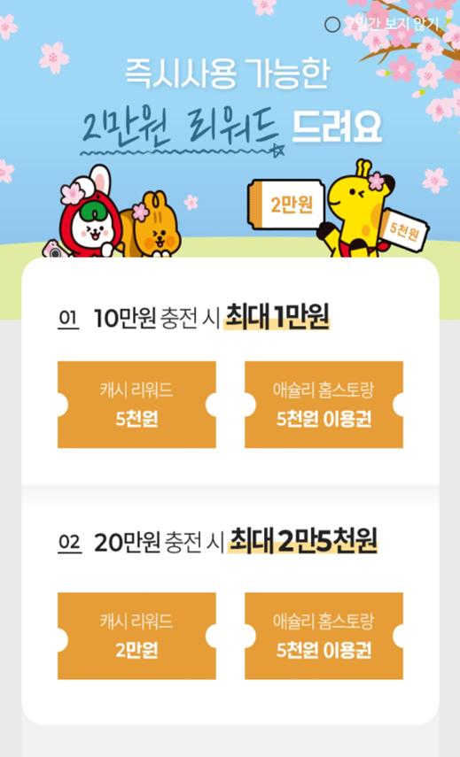 - 20만원 충전시 : 2만원 캐쉬백 + 애슐리 홈스트랑 5천원 이용권 ← 추천