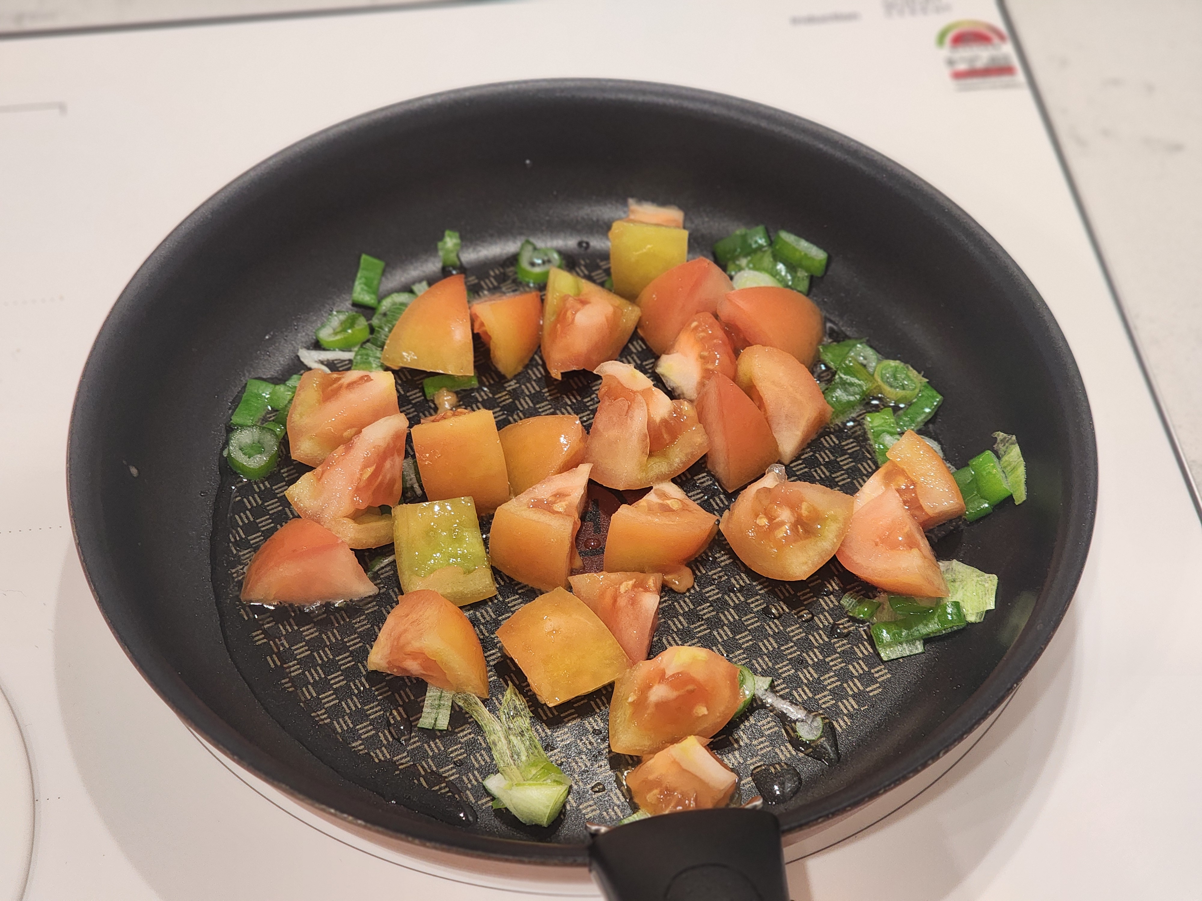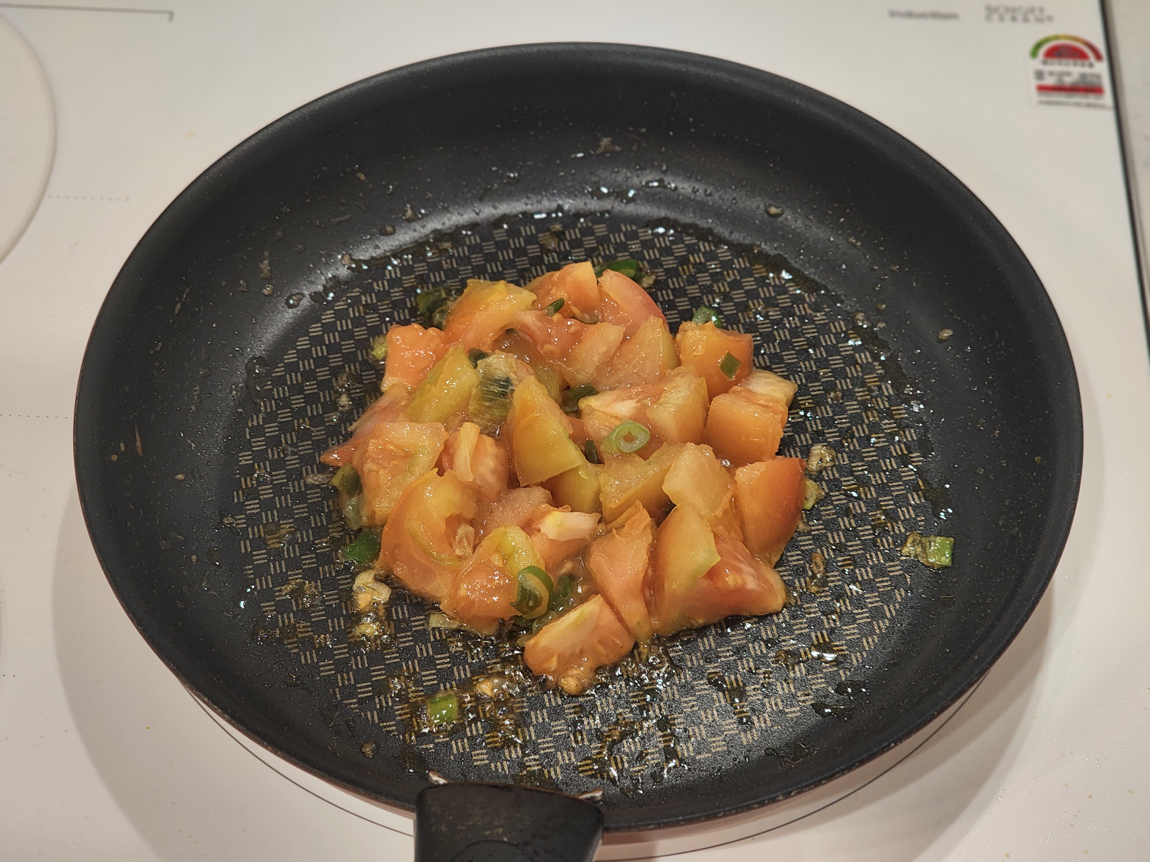 2) 파 향이 올라올 때 쯤, 썰어둔 토마토를 투하하여, 취향 껏 볶아줍니다.