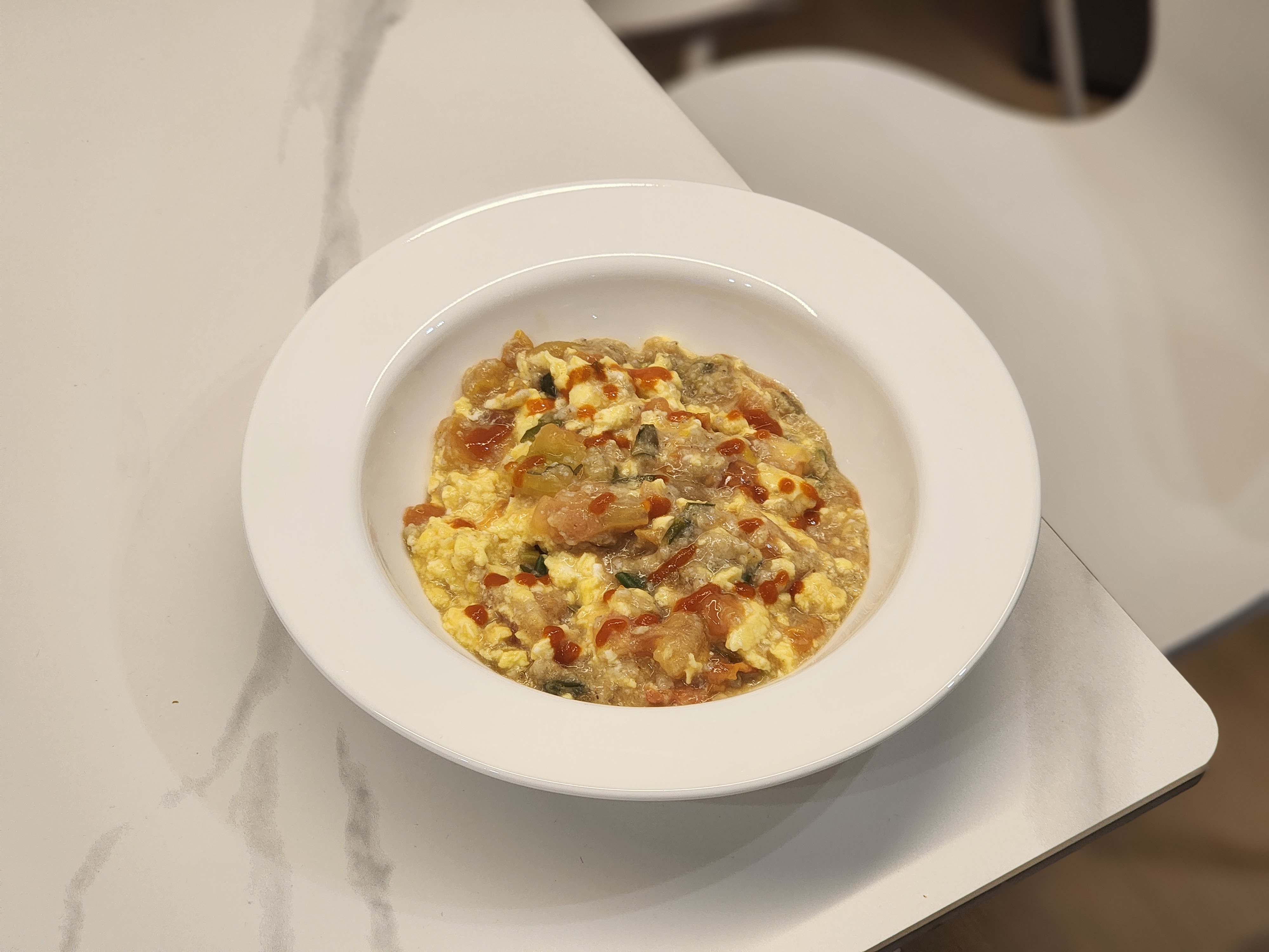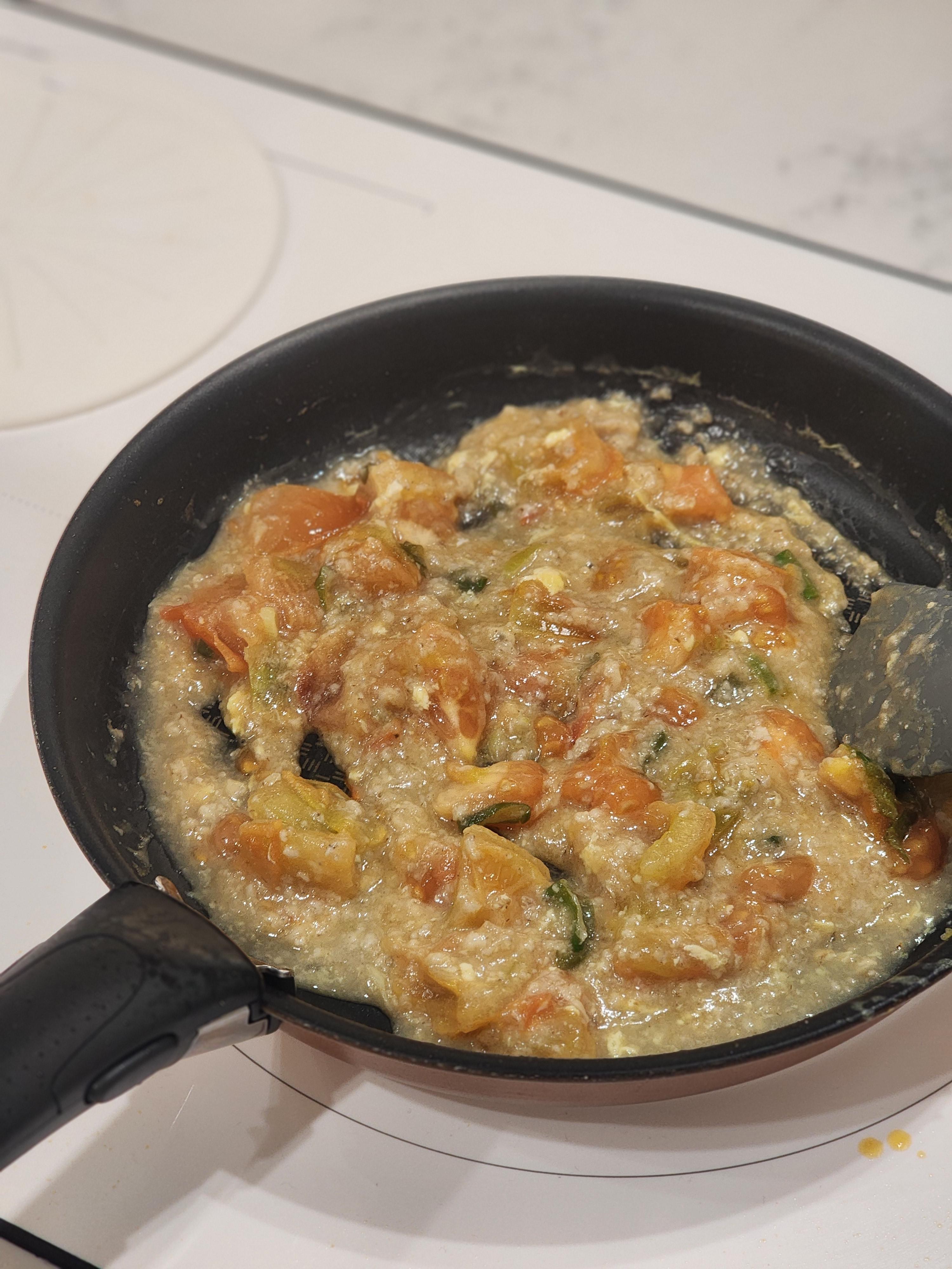 오트밀죽에 볶은 토마토를 먼저 넣어서 볶고(저는 죽 물 조절 실패로 졸이기,,) 스크램블은 넣고 섞자마자 불을 끄고 빼줍니다.