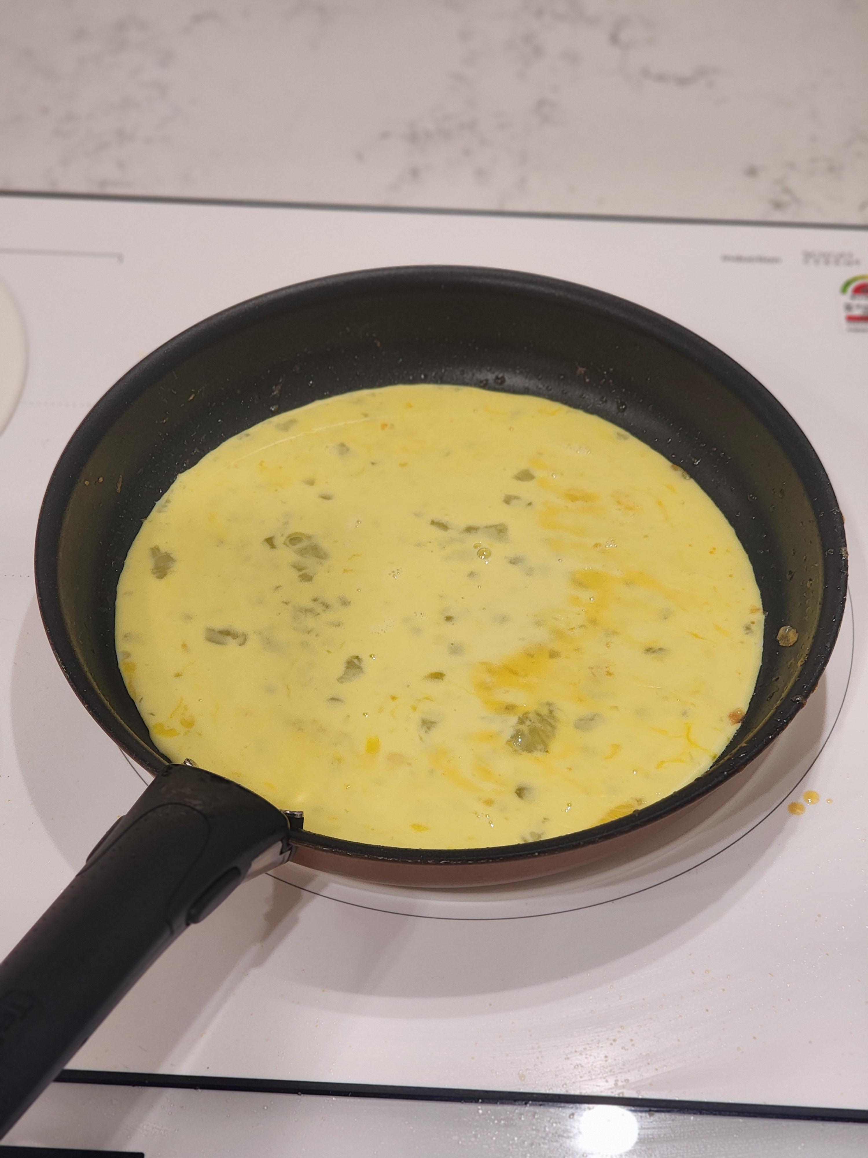 3) 풀어둔 계란물을 팬에 부어 스크램블을 만들겠습니다.