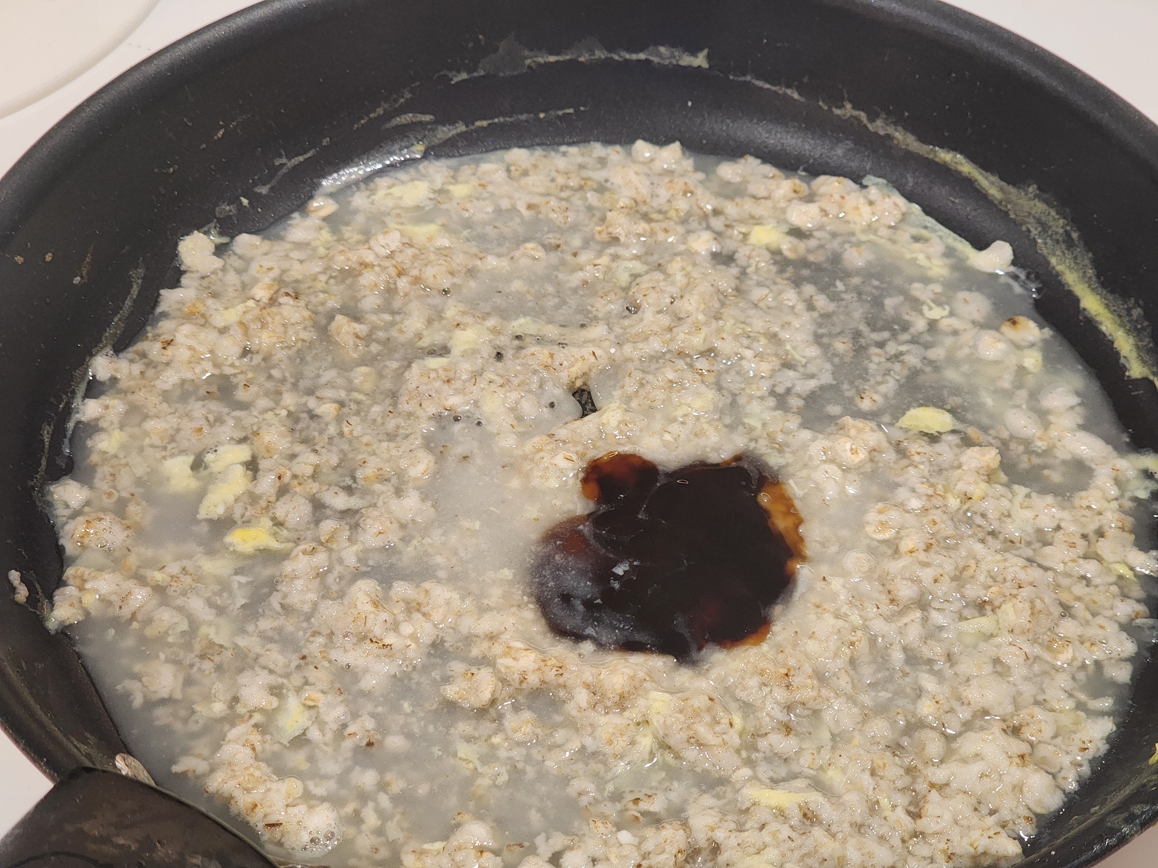 우리의 프라이팬은 쉴 틈이 없습니다. 스크램블을 덜어내고 난 뒤 조금의 물을 붓고 오트밀을 투하해줍니다.