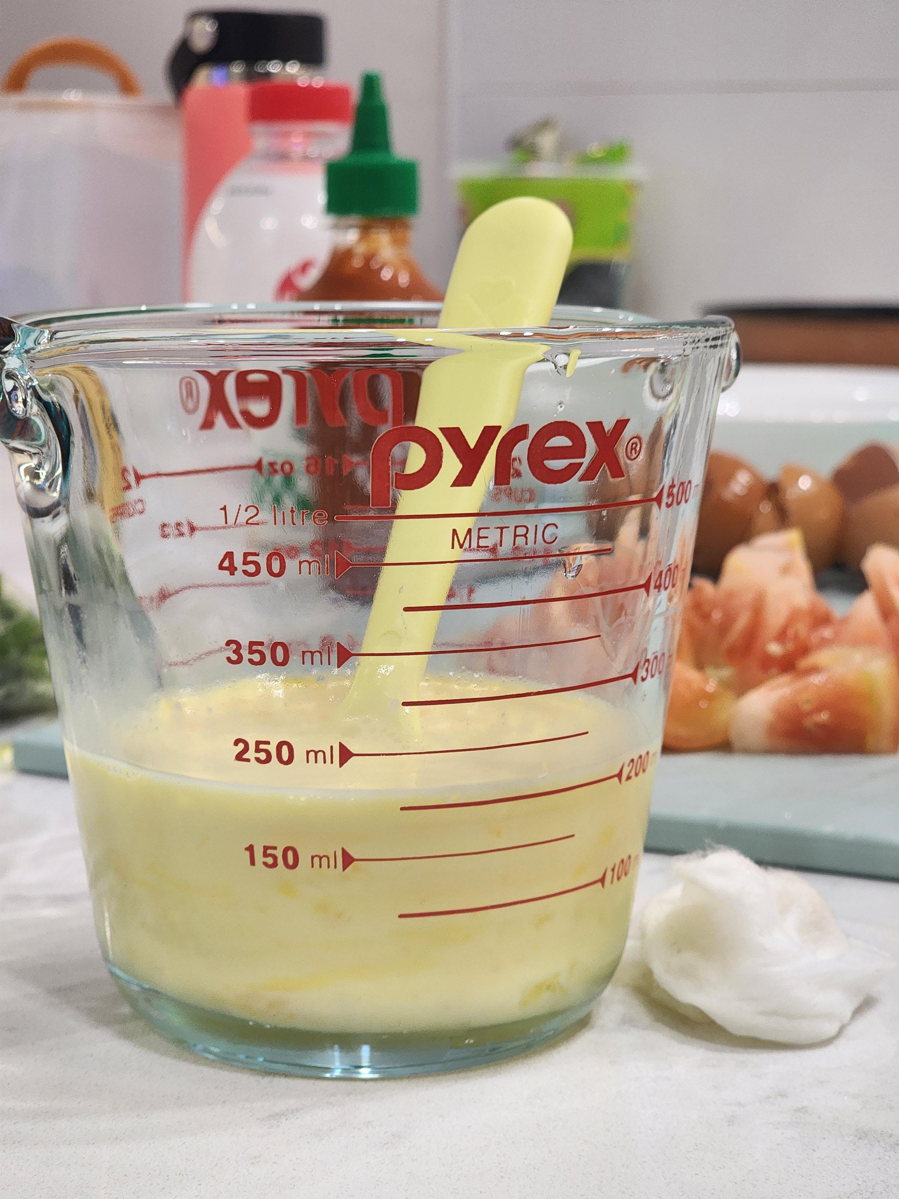 저는 계란 3알(50g*3)에 우유 50ml 첨가해 200ml를 만들어주었습니다.
