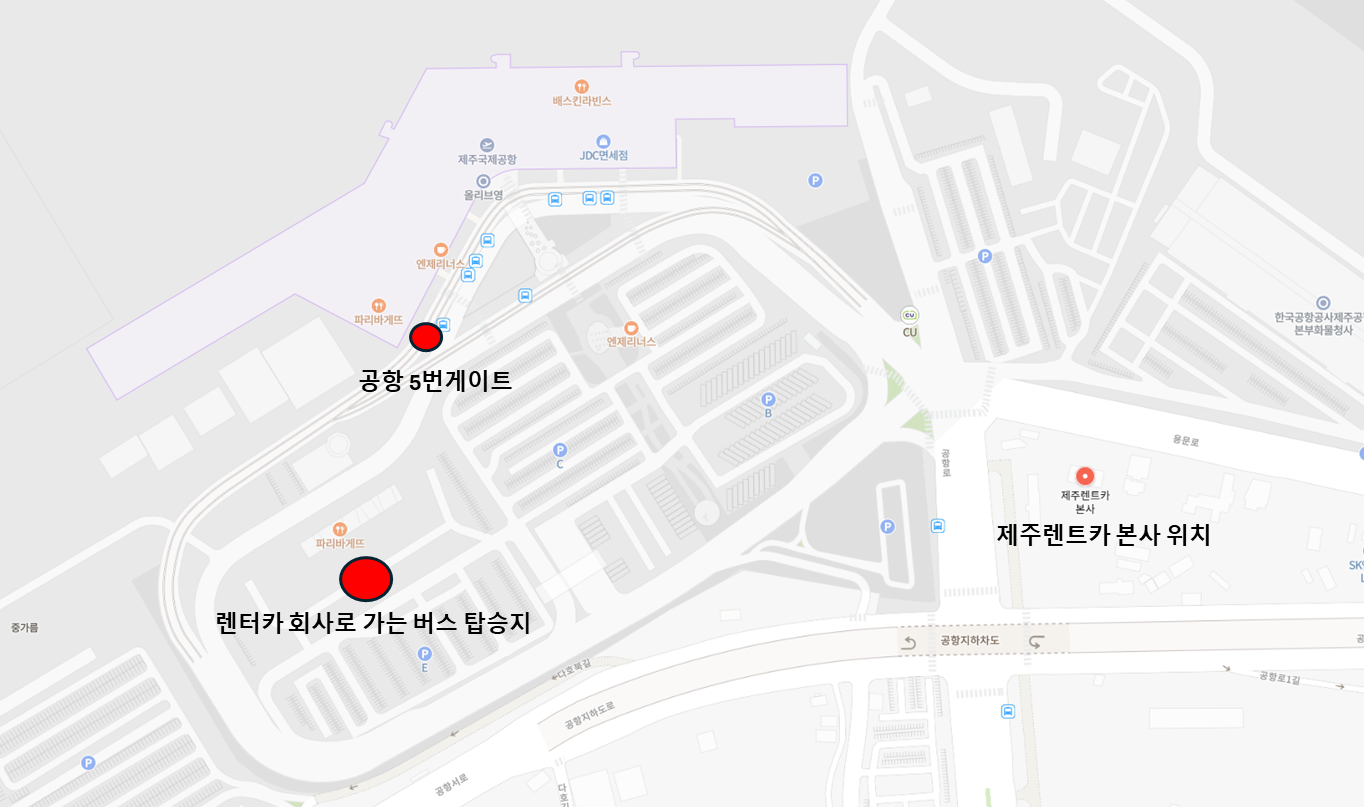 제가 '제주렌트카' 본사를 추천드리는 두번 째 이유는 바로 제주국제공항과 압도적으로 가까운 거리 때문입니다. 아시겠지만 제주도 렌트카를 이용하는 방법은 다음과 같습니다. 제주도 공항에 내린 후 공항 '5번 게이트'로 나와서 아래 표시된 렌터카 회사로 가는 셔틀 버스 탑승지까지 걸어서 이동해야 합니다. 이동 후 본인이 예약한 렌터카 회사의 셔틀을 타고 렌터카 회사로 가는 시스템입니다.