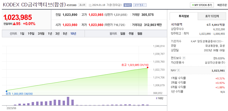 또한 KODEX CD금리액티브(합성) ETF는 현재 파킹형 ETF중 가장 낮은 보수율 0.02%/연을 자랑합니다.