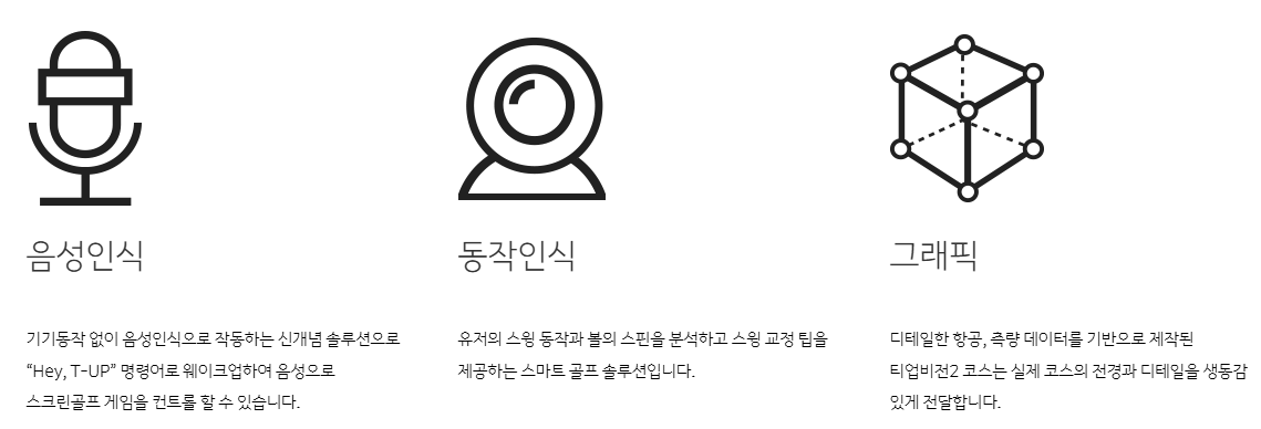 티업비전 모델의 가장 큰 특징은 바로 업계 최초로 음성 & 동작인식 인공지능 기술을 적용했다는 것입니다. 물론 요즘 나오고 있는 스골프존 모델들도 다 적용이 되었지만 가장 최초 적용된 모델은 티업비전의 T2 모델이라고 합니다.