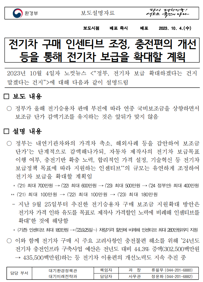 위 첨부된 이미지는 환경부에서 배포한 10월 전기차 보조금 24년 계획에 대해 보도설명자료입니다.